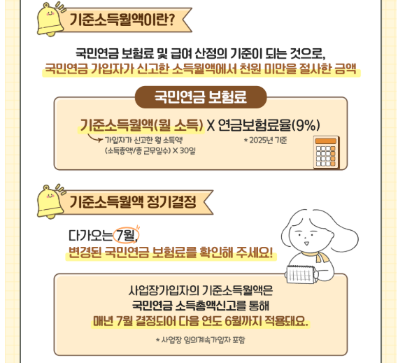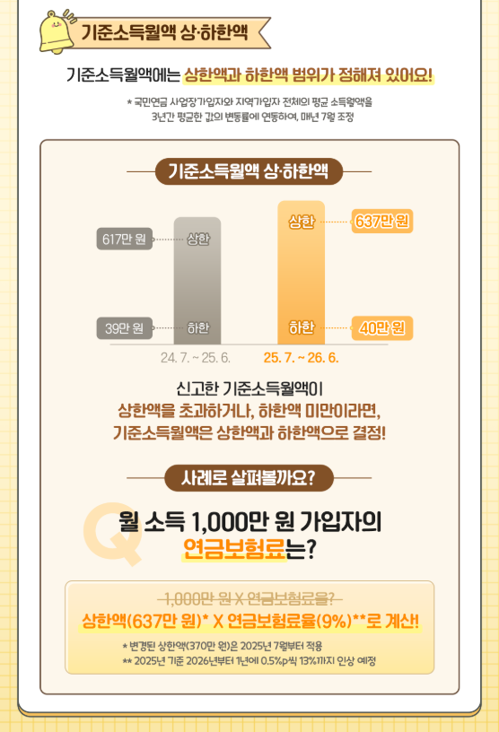 2025년 7월 1일부터 국민연금 보험료 부과 기준인 ‘기준소득월액’ 상·하한액이 조정됩니다.